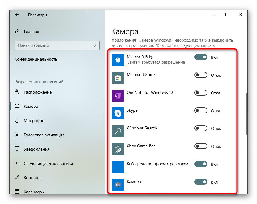 В списке прав доступа к приложениям слева выберите Камера. Включите тумблер «Разрешить приложениям доступ к вашей камере».