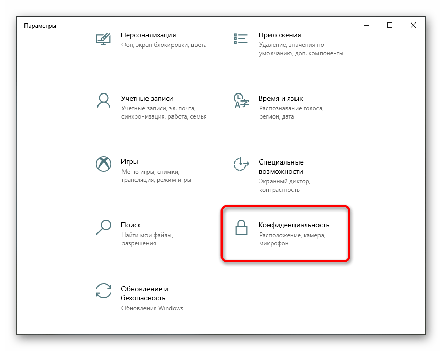 1. Нажмите одновременно клавиши WIN + I на клавиатуре и откройте раздел «Конфиденциальность».