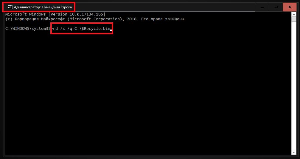 В ней задается команда «rd /s /q C:\$Recycle.bin», после чего нажимается клавиша ввода