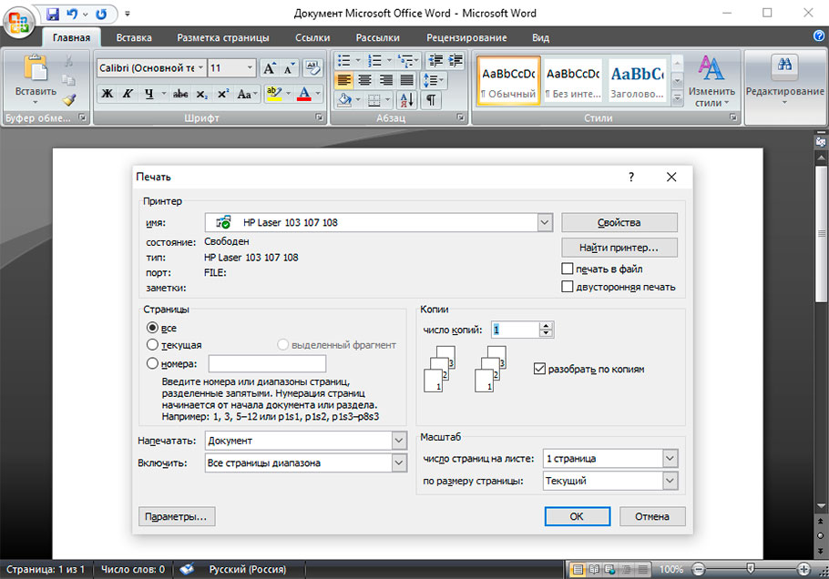Печать документа Word через другой драйвер принтера