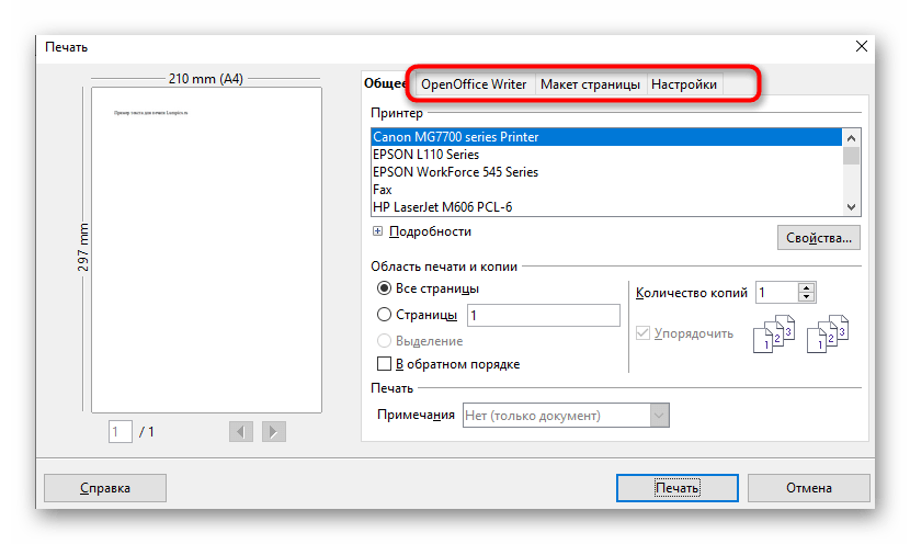 Если он там отсутствует, перемещайтесь по вкладкам настройки печати в текстовом редакторе, просматривая каждое отдельное меню и дополнительные параметры.