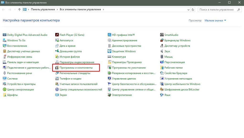 В «Панели управления» выбираем элемент «Программы и компоненты»