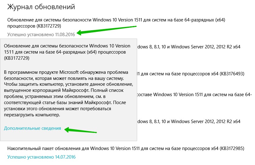 Далее, чтобы узнать подробности обновления, нажмите на вкладку — Успешно установлено «Дата обновления». В открывшемся окне будут показаны подробности обновления. Если нажать на вкладку — Дополнительные сведения, то вы попадёте на сайт Microsoft.