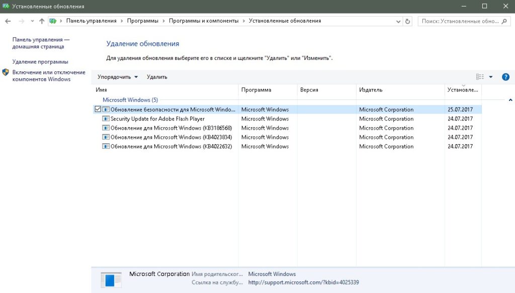 Выбираем из списка необходимое обновление и удаляем его, нажав на соответствующую кнопку