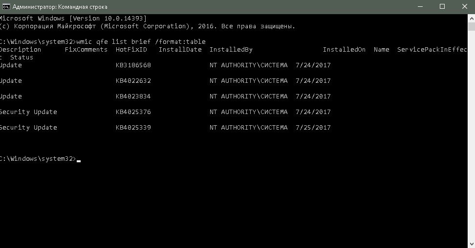 Команда wmic qfe list brief /format:table выводит все установленные обновления таблицей
