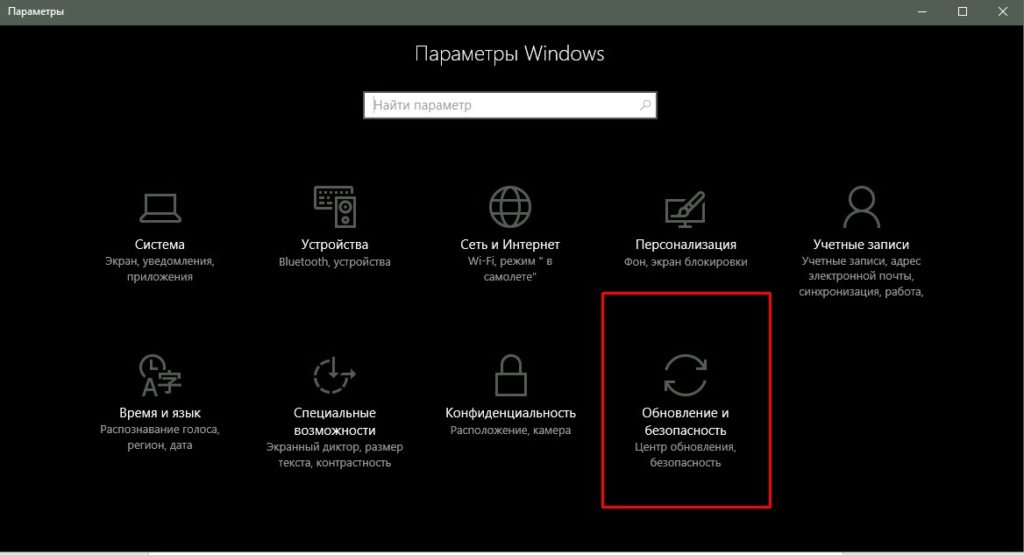 Далее, на странице “Параметры” нажмите на вкладку – Обновление и безопасность .