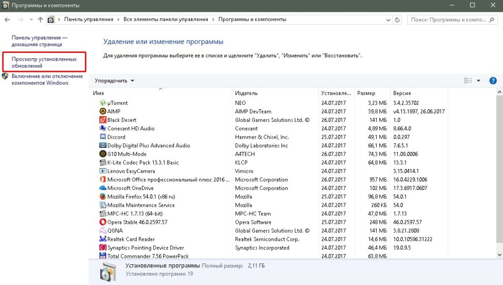 На Windows 10 информация об обновлениях представлена в двух видах. Первый — это список установленных апдейтов в «Панели управления». В нём вы можете посмотреть имя обновления, программу, к которой оно относится, версию, издателя, дату инсталляции. Но самая главная возможность — удаление установленного апдейта.
