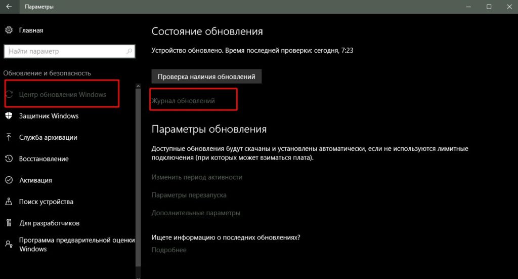 Журнал обновлений Windows 10