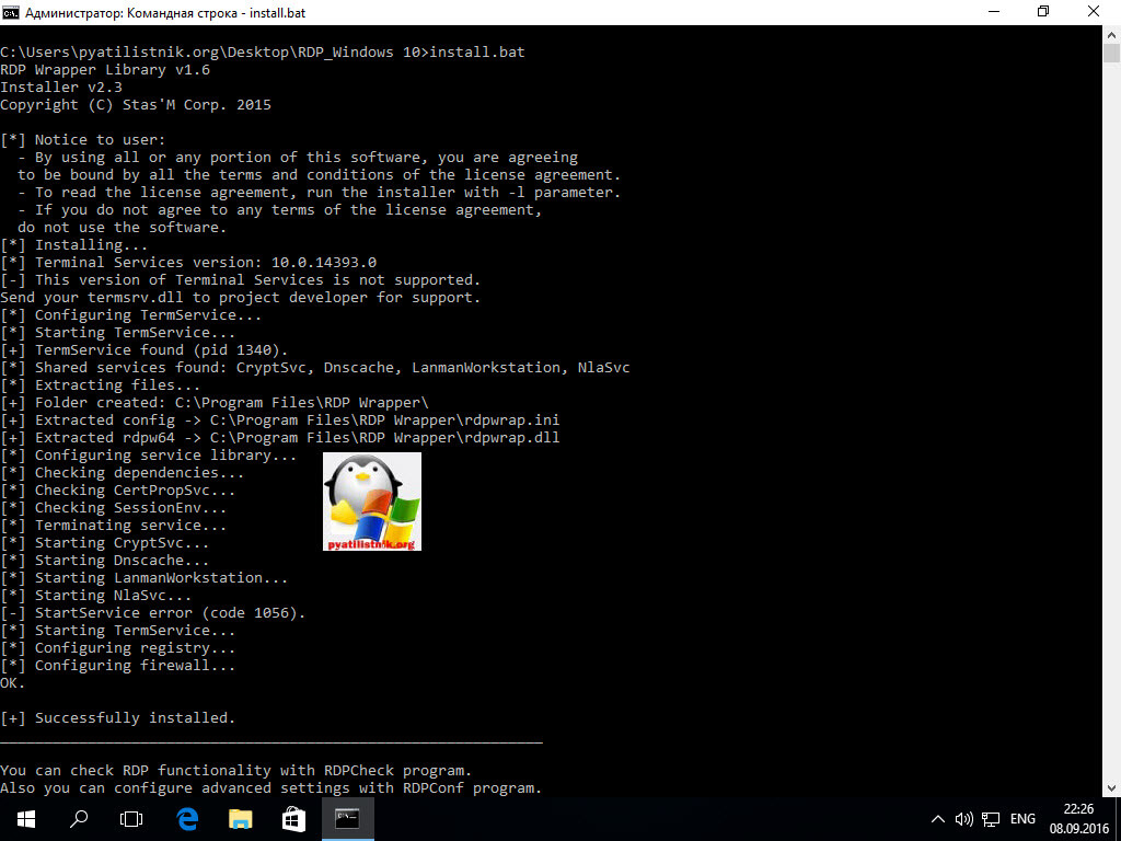 для установки и превращения видоус 10 в терминальный сервер, пишем install.bat. Начнется отработка скрипта, в результате вы увидите, что будут извлечены библиотеки rdpwrap.dll и ini, которые будут помещены в директорию C:\Program Files\RDP Wrapper, будут установлены необходимые сервисы. После отработки скрипта нажимаем любую клавишу.