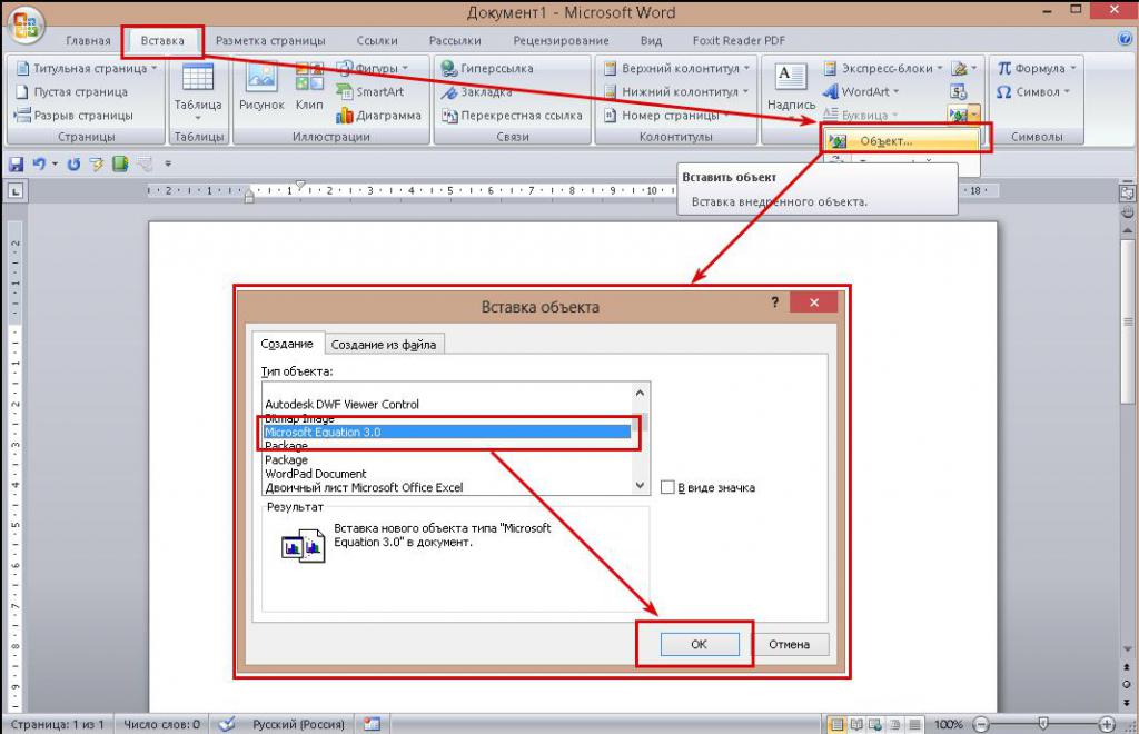 - В новом маленьком окошке выделить строчку Microsoft Equation 3.0 и нажать «Ок».