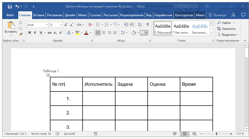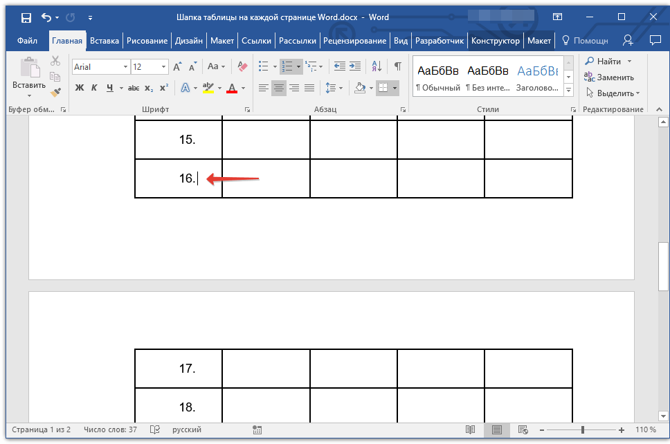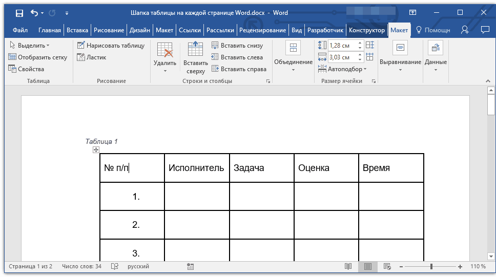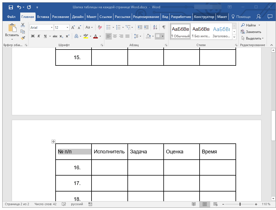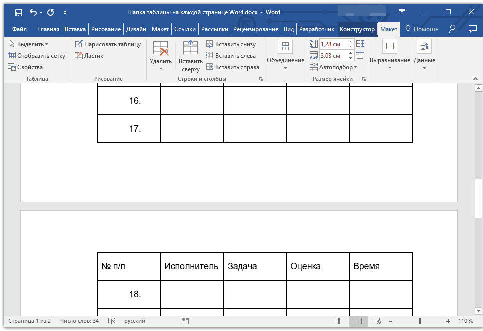 Готово! Теперь основная шапка таблицы, состоящая из нескольких строк, будет отображаться только на первой странице, а добавленная вами строка будет автоматически переносится на все последующие страницы документа, начиная со второй.