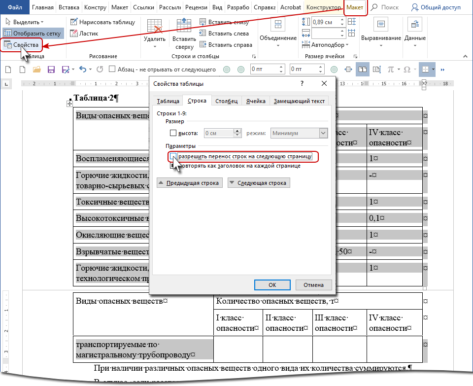 Шаг 2. Запретить перенос слов (лента «Макет» → группа команд «Таблица» → команда «Свойства» → диалоговое окно «Свойства таблицы» → снимите флажок «Разрешить перенос слов на следующей странице»):